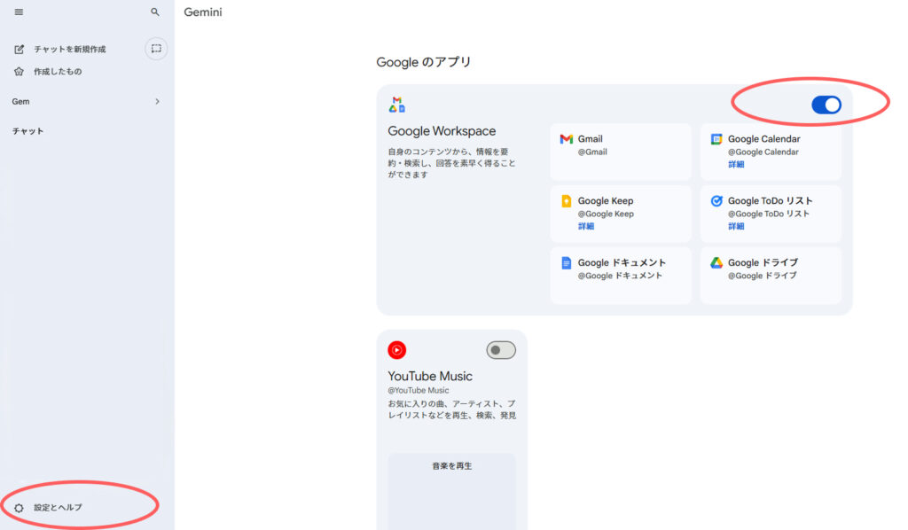 重要: 初めてオンにする際、「Google Drive、Gmail、Calendarへのアクセスを許可しますか?」という確認画面が出ます。ここで「接続」を承諾することで、Geminiがメールや予定を読み書きできるようになります。